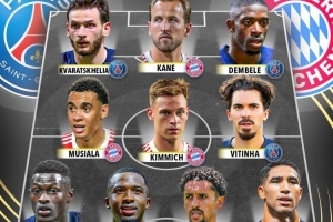 Score90列出了巴黎、拜仁合體陣容,登貝萊、凱恩領(lǐng)銜,巴黎8名球員入選。