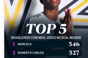 維尼修斯追平卡塞米羅,成為皇馬隊(duì)史出戰(zhàn)比賽第3多的巴西球員,位居他身前的是馬塞洛(546場(chǎng))以及卡洛斯(527場(chǎng)),羅德里戈以281場(chǎng)位居第5。