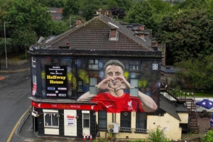 這幅畫描繪了若塔慶祝進球的瞬間。壁畫位于距離紅軍主場不遠處的半路屋酒吧外墻上,這里離若塔自2020年9月從狼隊加盟后享受過無數(shù)歡樂時光的地方僅幾步之遙。