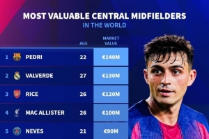 體育資訊11月2日訊 德國轉(zhuǎn)會市場列出了中場中路球員(Central Midfielders)身價排名,佩德里、巴爾韋德、賴斯前三。