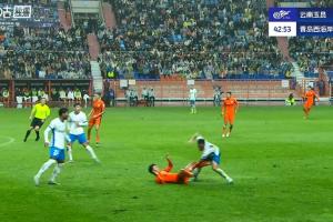 這下太痛了!第43分鐘,宋浩宇防守時被倒地的羅競踢到襠部