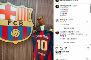亞馬爾曬出自己手持10號球衣與巴薩隊徽的合影,并配文:我的號碼、我的故事、我的方式x10????