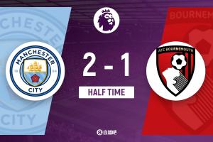 半場(chǎng)結(jié)束,曼城2-1伯恩茅斯。