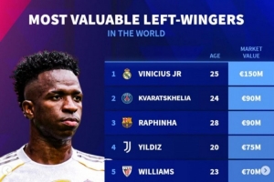體育資訊11月3日訊 德轉(zhuǎn)列當前世界足壇左邊鋒身價排行,維尼修斯1.5億歐居首,克瓦納茨赫利亞、拉菲尼亞9000萬歐并列第二。