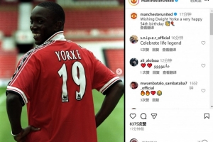 曼聯(lián)官方社媒曬出約克身穿本隊(duì)球衣的照片,配文:“祝德懷特-約克54歲生日快樂(lè)?!?/p>