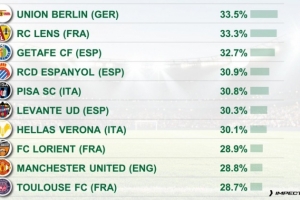 體育資訊11月4日訊 CIES統(tǒng)計了本賽季五大聯(lián)賽球隊攻防轉(zhuǎn)換階段占據(jù)進攻總時間的比例,并列出榜單,柏林聯(lián)合由守轉(zhuǎn)攻占比33.5%居首,朗斯33.3%、赫塔費32.7%二三位。