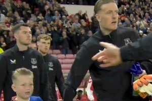 此役皮克福德?lián)伟8ヮD首發(fā)門將,他的兒子身穿桑德蘭和埃弗頓的拼接球衣入場。