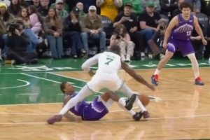 記者:在比賽第四節(jié)還剩約47秒時(shí),基昂特-喬治在杰倫-布朗突破上籃的過程中摔倒在地。隨后,布朗也倒在了喬治身上,但裁判并未吹罰犯規(guī)。對于這一回合,你的看法是什么?為什么沒有對喬治吹罰犯規(guī)?