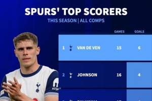 德國(guó)轉(zhuǎn)會(huì)市場(chǎng)統(tǒng)計(jì)了本賽季熱刺隊(duì)內(nèi)球員的進(jìn)球數(shù)量,并列出榜單,中衛(wèi)范德芬6球居首。