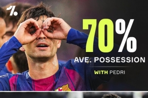 Onefootball統(tǒng)計了佩德里本賽季在場和缺陣時巴薩的控球率。佩德里本賽季出場時巴薩平均控球率70%,他缺席時巴薩平均控球率為50%,降低20%。