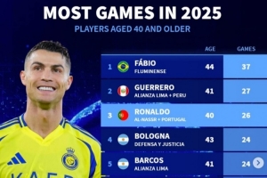 體育資訊7月17日訊 《轉(zhuǎn)會(huì)市場(chǎng)》統(tǒng)計(jì)了2025年的40+職業(yè)球員出場(chǎng)情況,C羅位列第三位。