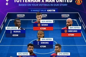 體育資訊11月8日訊 北京時間今天晚上20點30分,熱刺將在英超第11輪比賽中主場對陣曼聯(lián)。德國轉(zhuǎn)會市場根據(jù)關(guān)注者的投票列出熱刺+曼聯(lián)陣容,B費、舍什科、西蒙斯、范德芬在列。