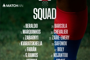 中場(chǎng):8-法比安、17-維蒂尼亞、24-馬尤盧、33-扎伊爾-埃梅里、87-若昂-內(nèi)維斯