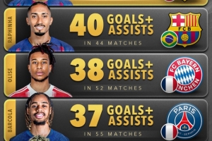 體育資訊11月10日訊 Score90統(tǒng)計了2025年五大聯(lián)賽邊鋒在俱樂部+國家隊比賽中參與進球的數(shù)量,并列出榜單。