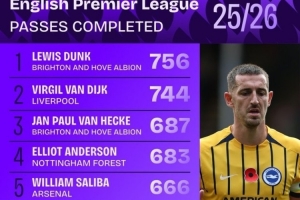 體育資訊11月11日訊 英超聯賽已經進行了11輪,squakwa也統計了本賽季英超成功傳球榜,中場球員僅埃利奧特·安德森和蘇維門迪。