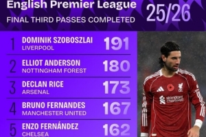 體育資訊11月11日訊 英超聯(lián)賽已經(jīng)進行了11輪,squakwa也統(tǒng)計了本賽季英超進攻三區(qū)的成功傳球榜,索博斯洛伊居首。