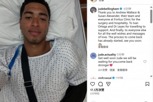 貝林厄姆寫道:“感謝安德魯-華萊士、蘇珊-亞歷山大及其醫(yī)療團隊,以及Fortius診所的所有工作人員,感謝熱情接待并成功完成手術。還要感謝伊萬-奧爾特加和萊耶斯醫(yī)生特意前來支持。最后,感謝所有人的美好祝愿。我已經(jīng)開始了復出進程,很快就會與大家見面。”