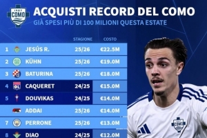 體育資訊7月18日訊 德國(guó)轉(zhuǎn)會(huì)市場(chǎng)盤點(diǎn)了科莫隊(duì)史引援排行,今年夏天已花費(fèi)超過(guò)1億歐。