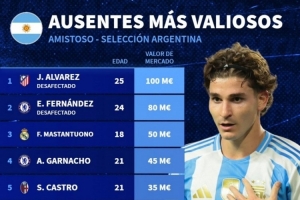 體育資訊11月12日訊 德國(guó)轉(zhuǎn)會(huì)市場(chǎng)統(tǒng)計(jì)了缺席本期阿根廷隊(duì)球員的身價(jià),并列出榜單,阿爾瓦雷斯1億歐居首,恩佐-費(fèi)爾南德斯8000萬(wàn)歐次席。