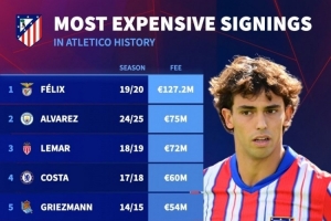 體育資訊11月12日訊 阿波羅體育資本斥資13億歐元收購馬競俱樂部55%股份,并承諾未來幾年再投資約13億歐元,德國轉(zhuǎn)會市場統(tǒng)計了馬競隊史引援的費用,并列出最貴引援排名。