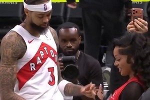 賽后,英格拉姆在場(chǎng)邊和歌手女友格洛麗亞在場(chǎng)邊秀恩愛。