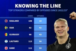 22-23賽季以來頂級前鋒越位次數(shù):哈蘭德18次最少,C羅143次最多