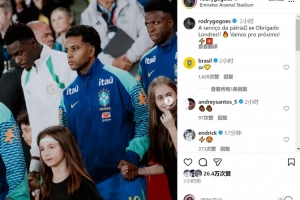 此役羅德里戈為巴西隊(duì)首發(fā)出戰(zhàn),定位球助攻卡塞米羅破門,賽后羅德里戈社媒曬照慶祝勝利,配文:“為國(guó)出戰(zhàn),感謝倫敦!專注于下一場(chǎng)比賽!”