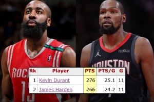 在代表火箭出戰(zhàn)的前11場(chǎng)比賽中,杜蘭特合計(jì)得到276分,超越哈登(266),隊(duì)史最多。