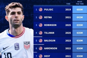 體育資訊11月16日訊 德國轉會市場盤點了美國球員歷史身價排名,2019年的普利西奇以6000萬歐元排名第一。