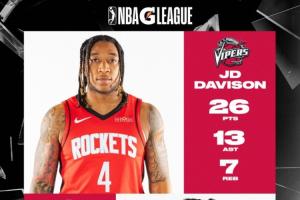 效力于毒蛇的火箭雙向合同球員JD·戴維森和以賽亞·克勞福德表現(xiàn)出色,分別貢獻26分7籃板13助攻,和27分7籃板。