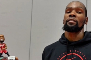 視頻中杜蘭特介紹搖頭娃娃細(xì)節(jié)。官推表示,今天前3000名入場(chǎng)的球迷將獲贈(zèng)娃娃。