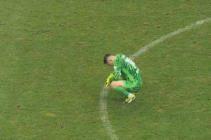 體育資訊07月19日訊 英博vs泰山半場結(jié)束,泰山半場0-1落后,王大雷蹲地懊惱久久不愿起身。