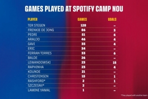 在當(dāng)前陣容中,五位隊(duì)長中的四位占據(jù)了隊(duì)內(nèi)諾坎普球場出場次數(shù)榜的前列:特爾施特根、弗蘭基·德容、佩德里和阿勞霍。
