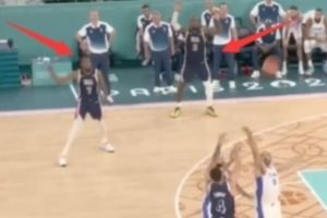 談到巴黎奧運(yùn)會(huì)決賽“金色匕首”驚世一投,庫里笑道:“我到現(xiàn)在想到那張照片就想笑,你(指詹姆斯)和KD在那兒高舉著雙手(要球)?!?/p>