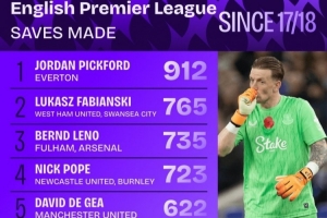 體育資訊11月19日訊 Squawka統(tǒng)計(jì)17-18賽季至今英超門將撲救次數(shù),皮克福德912次居首,法比安斯基第二。