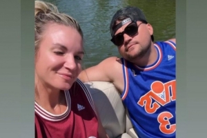 為慶祝“球衣日”,目前的Spectrum SportsNet湖人女記者Allie Clifton曬出自己與老公身穿詹姆斯騎士球衣的度假合影。