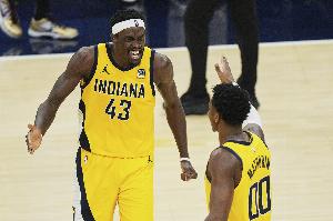 上半場步行者四人得分上雙,分別是馬瑟林16分5板1助、西亞卡姆11分1板3助、赫夫10分4板4助3帽、內(nèi)姆哈德10分5助。