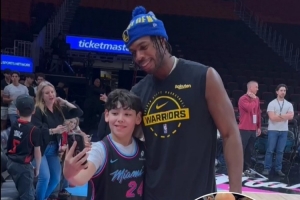 在今天比賽熱身間隙,希爾德看到場(chǎng)邊一位熱火小球迷舉著一個(gè)牌子,上面寫(xiě)著:“生日愿望是可以和希爾德自拍?!毕柕驴吹胶笠埠荛_(kāi)心的完成了小球迷的生日愿望。