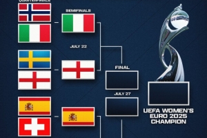 體育資訊7月20日訊 2025女足歐洲杯半決賽對陣出爐,意大利、英格蘭、西班牙和德國會師四強(qiáng)。