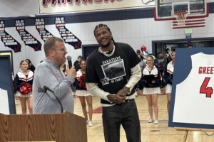 體育資訊11月21日訊 昨日,太陽后衛(wèi)杰倫·格林的高中球衣退役儀式在圣華金紀(jì)念高中舉行。