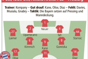 體育資訊11月22日訊 拜仁將在本輪德甲焦點戰(zhàn)坐鎮(zhèn)主場對陣弗賴堡,德媒《慕尼黑日報》也預測了拜仁首發(fā)。