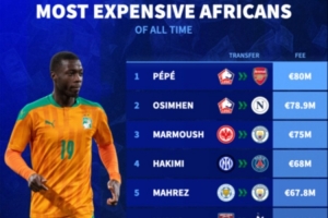 體育資訊7月20日訊 德轉(zhuǎn)網(wǎng)站統(tǒng)計(jì)了非洲球員的最高轉(zhuǎn)會(huì)費(fèi),佩佩從里爾加盟阿森納的8000萬歐元居首,具體情況如下: