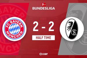 上半場(chǎng)傷停補(bǔ)時(shí)3分鐘,半場(chǎng)結(jié)束,拜仁暫2-2弗賴堡。