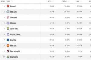數據機構Opta的大數據預測再度進行更新,目前英超各隊的奪冠概率:阿森納奪冠概率升至70.18%,曼城18.11%;利物浦4.22%,切爾西3.47%。該榜單的第5名為1.44%的維拉,其余球隊奪冠概率均不足1%。