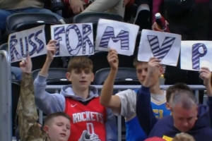 在本場(chǎng)比賽中,有一位身穿火箭0號(hào)的球迷舉著威少M(fèi)VP的牌子。