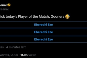 賽后阿森納官方在社媒發(fā)布投票,評選本場最佳球員,三個選項均為上演帽子戲法的埃澤。