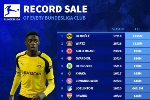 1、多特:登貝萊,1.35億歐,17-18賽季