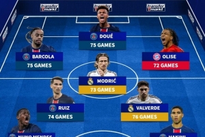 上賽季出場(chǎng)最多球員陣容(包括俱樂部+國(guó)家隊(duì))