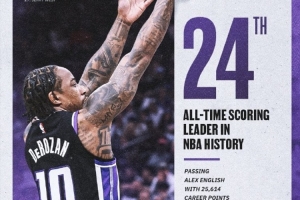 截至第四節(jié)中,德羅贊本場拿下了19分。至此他個(gè)人生涯總得分(賽前25596分)超越了英格利什(25613分),升至NBA歷史第24位。接下來德羅贊將追趕卡特(25728)。