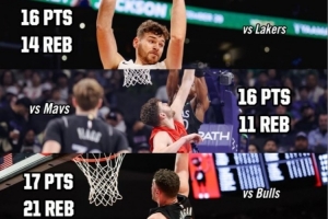 賽后,開拓者官推曬出克林根近五場兩雙的數據圖,并寫道:“得分?籃板?他全都要??肆指罱谋憩F(xiàn)(如圖),包括五次兩雙。”